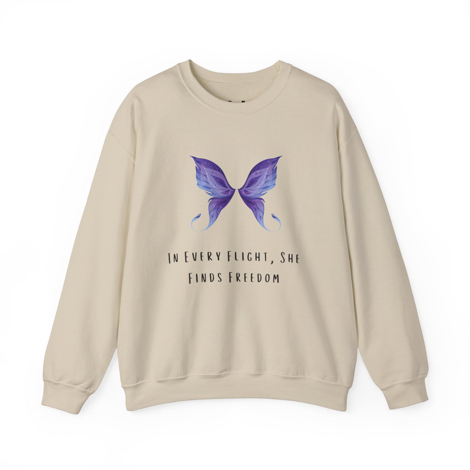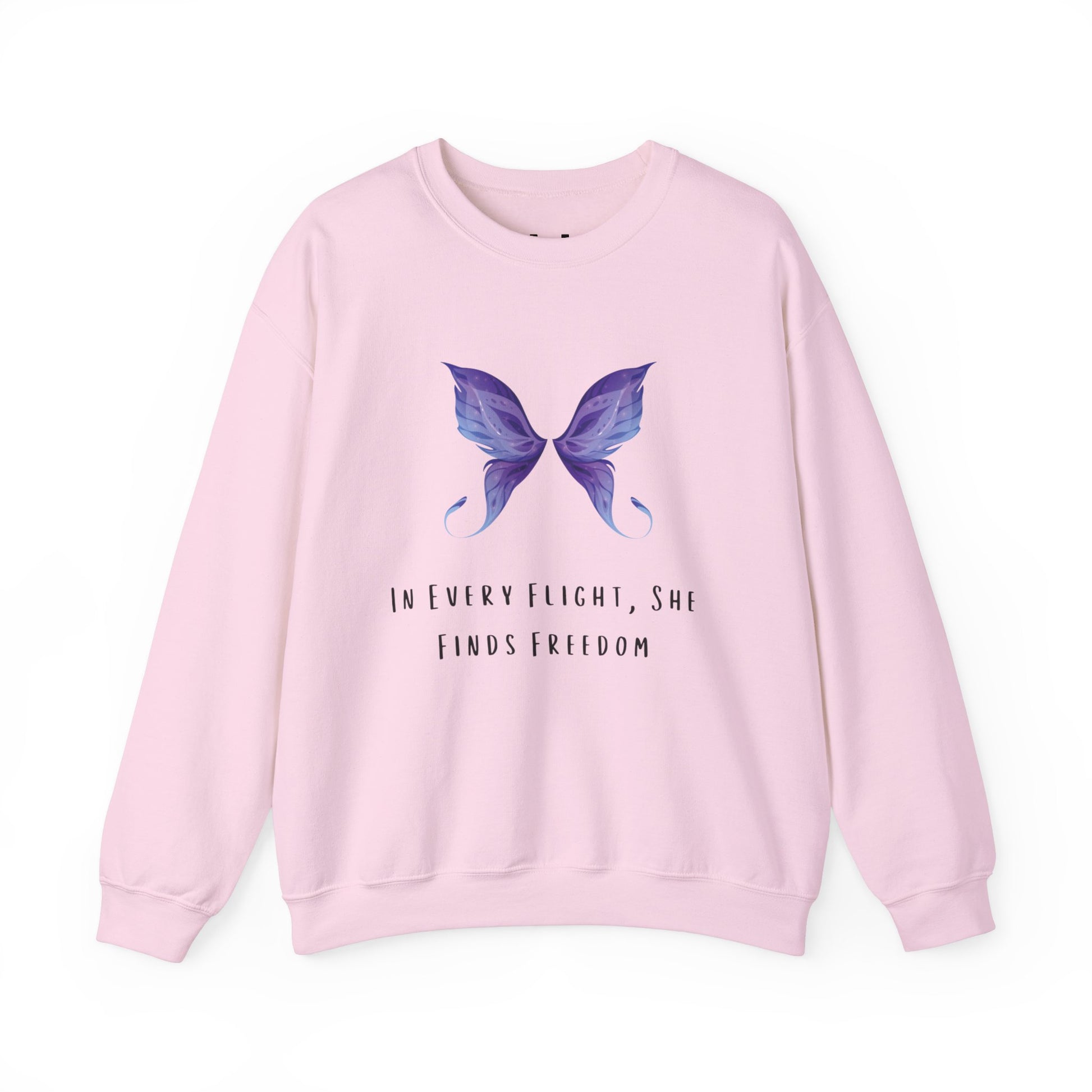 The sweatshirt features a captivating butterfly print paired with the quote 'In Every Flight, She Finds Freedom.' This design is perfect for those who appreciate beauty and empowerment in their clothing.